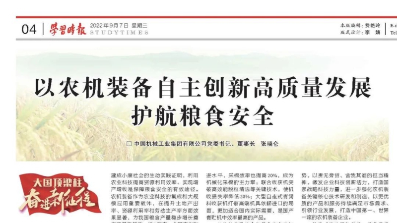 9月7日,《学习时报》刊载国机集团党委书记、董事长张晓仑署名文章《以农机装备自主立异高质量生长护航粮食清静》。 全文如下: 《以农机装备自主立异高质量生长...