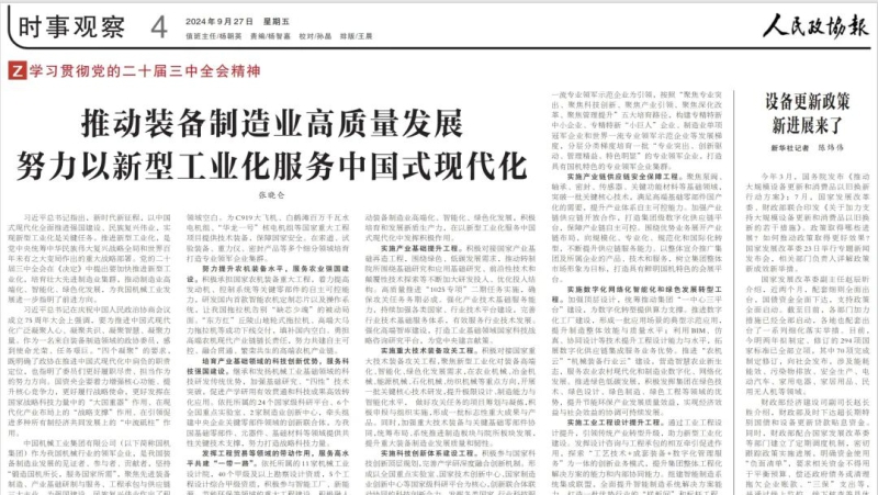 克日,《人民政协报》刊发天下政协委员,国机集团党委书记、董事长张晓仑署名文章《推动装备制造业高质量生长 起劲以新型工业化效劳中国式现代化》,讲述国机集团坚守...